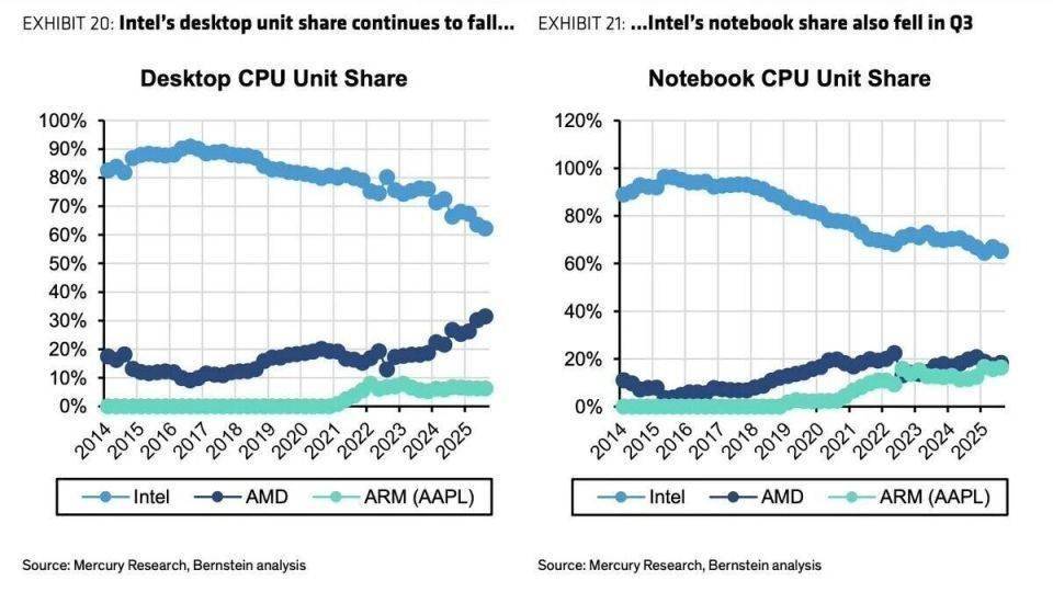 AMD在笔记本电脑市场的份额长期徘徊在20%左右,大概在21%至22%,而苹果现在已经逼近20%,大概在18%至19%,差距已经不大了。苹果市场份额的提升主要抢夺的是英特尔的市场份额,后者已经降至60%左右。苹果在台式机市场同样取得进展,占据了约10%的市场份额,不过这部分主要仍然由英特尔和AMD主导。与笔记本电脑不同,英特尔在台式机损失的市场份额主要是流向AMD。