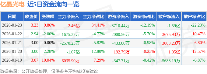证券之星消息,截至2026年1月23日收盘,亿晶光电(600537)报收于3.23元,上涨9.86%,涨停,换手率18.92%,成交量224.0万手,成交额7.15亿元。