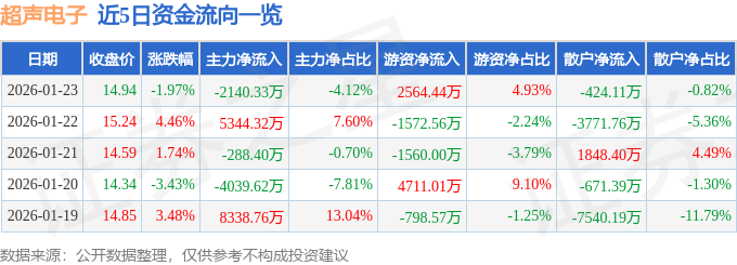 证券之星消息,截至2026年1月23日收盘,超声电子(000823)报收于14.94元,下跌1.97%,换手率6.49%,成交量34.83万手,成交额5.2亿元。
