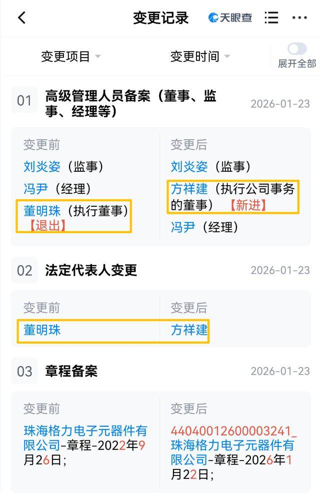 天眼查信息显示,近日珠海格力电子元器件有限公司发生工商变更:董明珠卸任法定代表人、执行董事,方祥建接任法定代表人并担任执行公司事务的董事。