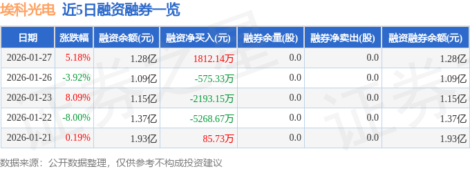 埃科光电融资融券信息显示,融资方面,当日融资买入5087.8万元,融资偿还3275.66万元,融资净买入1812.14万元。融券方面,融券卖出0.0股,融券偿还0.0股,融券余量0.0股,融券余额0.0万元。融资融券余额1.28亿元。
