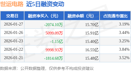 证券之星消息,1月27日,世运电路(603920)融资买入2.49亿元,融资偿还2.7亿元,融资净卖出2074.1万元,融资余额15.7亿元。