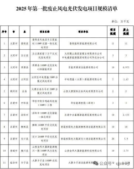 7月14日,山西省能源局发布公告,对2025年第二批拟废止的风电光伏发电项目清单进行公示。