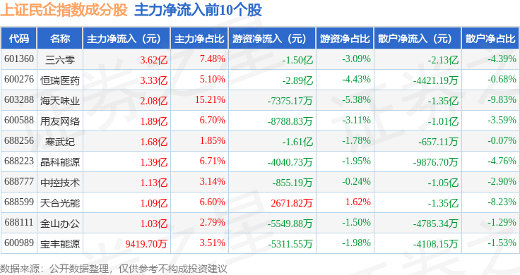 资金流向方面,上证民企(000049)指数成份股当日主力资金净流出合计62.3亿元,游资资金净流入合计13.26亿元,散户资金净流入合计49.04亿元。成份股资金流向详情见下表: