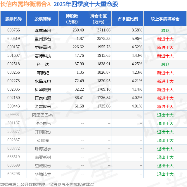 根据2025基金年报公募基金重仓股数据,重仓该股的公募基金共3家,其中持有数量最多的公募基金为长信基金的长信内需均衡混合A。长信内需均衡混合A目前规模为3.97亿元,最新净值0.7994(1月28日),较上一交易日上涨0.29%,近一年上涨60.23%。该公募基金现任基金经理为王祺。