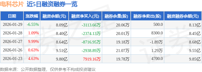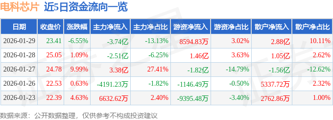 证券之星消息,截至2026年1月29日收盘,电科芯片(600877)报收于23.41元,下跌6.55%,换手率9.86%,成交量116.78万手,成交额28.5亿元。