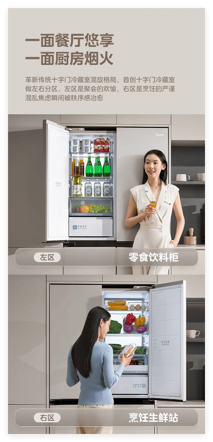 美的餐边柜冰箱虽然机身薄,但容量可不小,总容积427升,其中冷藏区259升,冷冻区168升,巨能装。不仅如此,这款冰箱还首创“左餐右厨”设计,通过十字门对冷藏室做左右分区,左边可存储零食、饮料、鲜果,右边存放蔬菜、调料、生鲜,既方便日常拿取,还有效避免了食材间相互串味的问题。更有可折叠搁架设计,像红酒、双层蛋糕这样的大件物品,也能轻松存放。