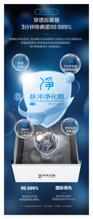 冰箱搭载的脉冲净化技术,可穿透包装袋对冰箱内的食材进行杀菌,仅需3分钟即可完成净化,对大肠杆菌、金黄色葡萄球菌、单核细胞增生李斯特氏菌、甲型流感病毒、肠道病毒、人冠状病毒的杀灭率高达99.999%。各类食材在使用前,都可先使用脉冲净化进行除菌消毒,入口更健康、更安心。