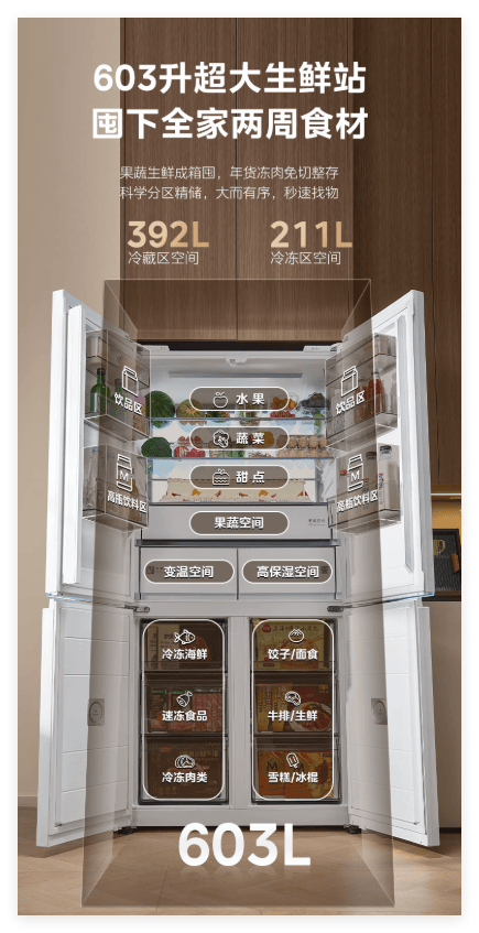 它的保鲜实力堪称出色,双系统双循环设计,让冷藏室与冷冻室独立控温,食材互不干扰,彻底杜绝串味烦恼。同时搭载雾化保鲜科技,打造恒湿存储环境,为果蔬等食材锁住水分,长久保持新鲜水润。更有负氧离子除菌科技,穿透保鲜袋净化,除菌、除病毒、除乙烯、分解异味,守护食材健康。