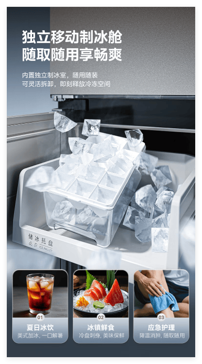 冰箱特别设置了独立移动制冰舱,可以根据需求灵活拆卸——用冰时装上,急速出冰;不用冰时拆下来,释放冷冻空间。
