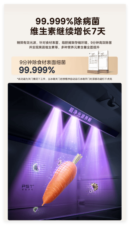 对于用户关注的健康问题,这款冰箱也有专门的解决方案。冷藏区采用PST+智能净化,3分钟急速净味,99.9999%除菌,可去除200余种有害物质,同时防霉、抑制食材腐败。冷冻区采用PT离子净化,保鲜、防霉、抗菌、抗病毒、净味五效合一,各类食材都可放心存,入口更安心。