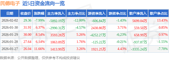 证券之星消息,截至2026年2月2日收盘,民德电子(300656)报收于29.36元,下跌7.99%,换手率10.54%,成交量14.01万手,成交额4.24亿元。
