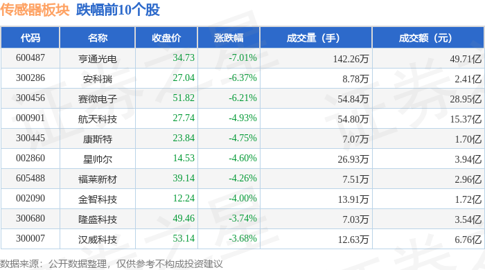 证券之星消息,2月5日传感器板块较上一交易日下跌0.61%,亨通光电领跌。当日上证指数报收于4075.92,下跌0.64%。深证成指报收于13952.71,下跌1.44%。传感器板块个股涨跌见下表: