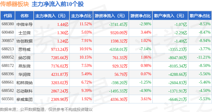 从资金流向上来看,当日传感器板块主力资金净流出28.98亿元,游资资金净流入9.84亿元,散户资金净流入19.14亿元。传感器板块个股资金流向见下表: