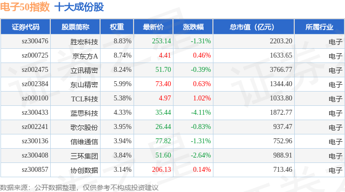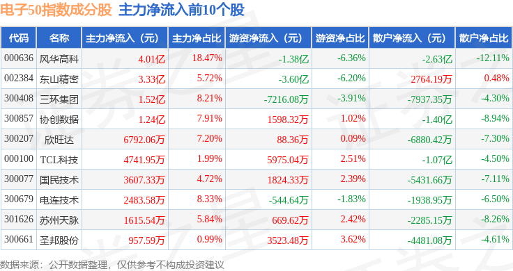 资金流向方面,电子50(399281)指数成份股当日主力资金净流出合计16.35亿元,游资资金净流入合计2.85亿元,散户资金净流入合计13.49亿元。成份股资金流向详情见下表: