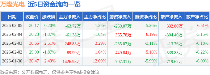 证券之星消息,截至2026年2月5日收盘,万隆光电(300710)报收于30.17元,下跌0.2%,换手率2.27%,成交量1.69万手,成交额5113.75万元。