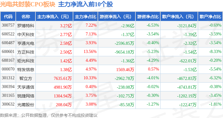 从资金流向上来看,当日光电共封装CPO板块主力资金净流出49.33亿元,游资资金净流入24.29亿元,散户资金净流入25.04亿元。光电共封装CPO板块个股资金流向见下表:
