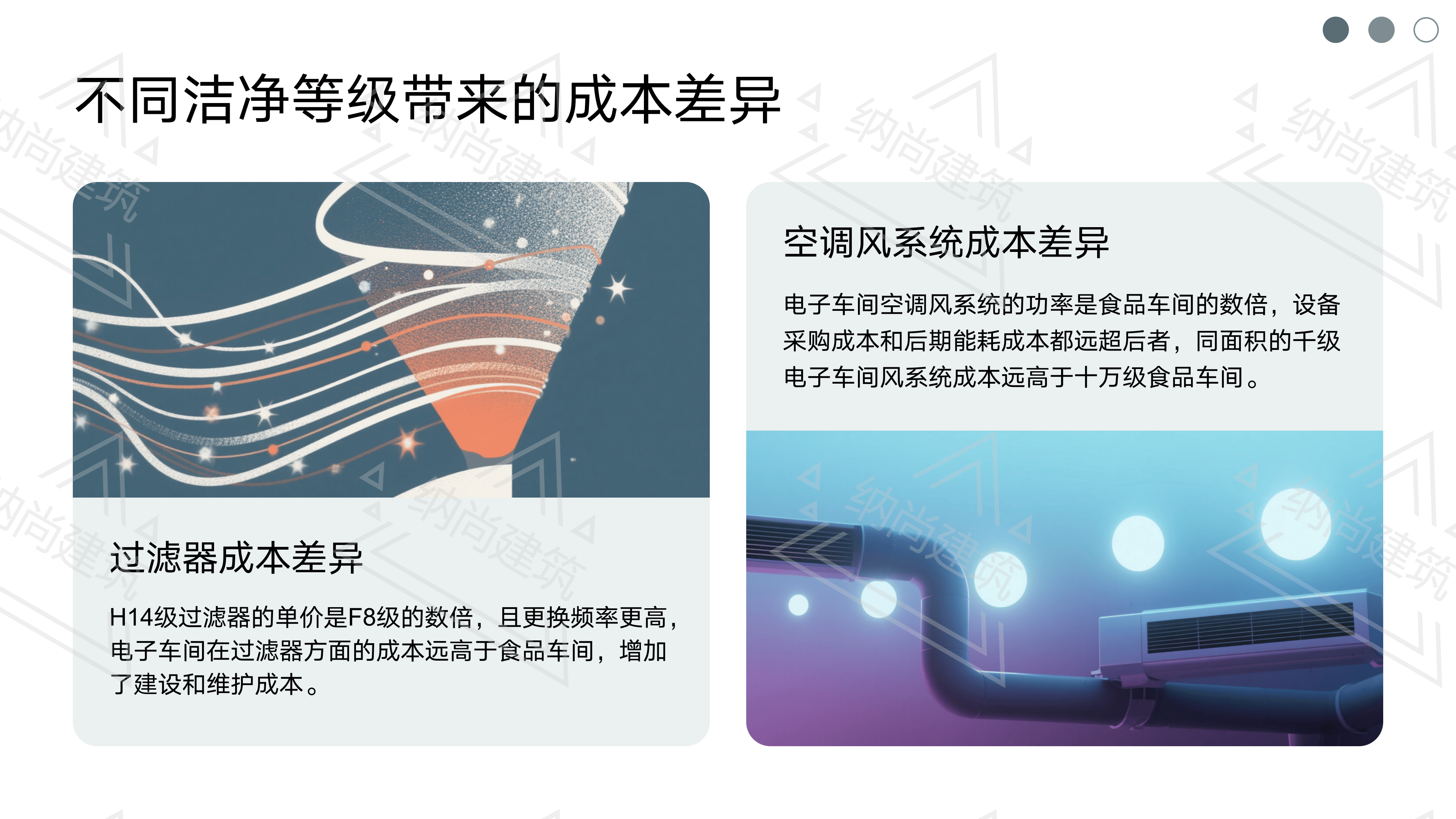 从成本角度看,H14 级过滤器的单价是 F8 级的数倍,且更换频率更高;电子车间空调风系统的功率是食品车间的数倍,设备采购成本和后期能耗成本都远超后者。直观来看,同面积的千级电子车间风系统成本远高于十万级食品车间,单这一项就拉开了巨大的成本差距。