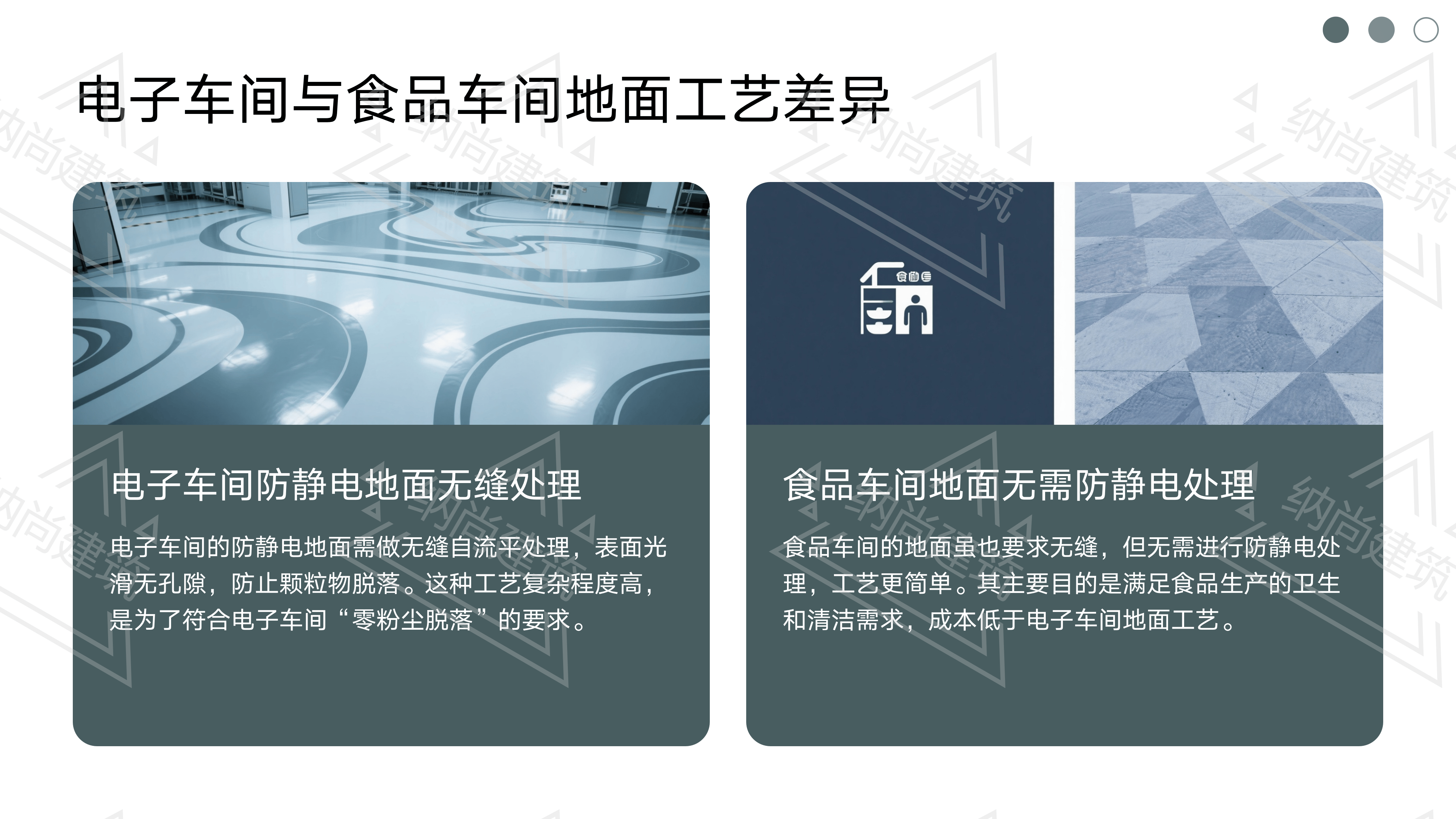 在地面工艺上,电子车间的防静电地面需做无缝自流平处理,表面光滑无孔隙,防止颗粒物脱落,工艺复杂程度更高;食品车间的地面虽也要求无缝,但无需防静电处理,工艺更简单,成本更低。