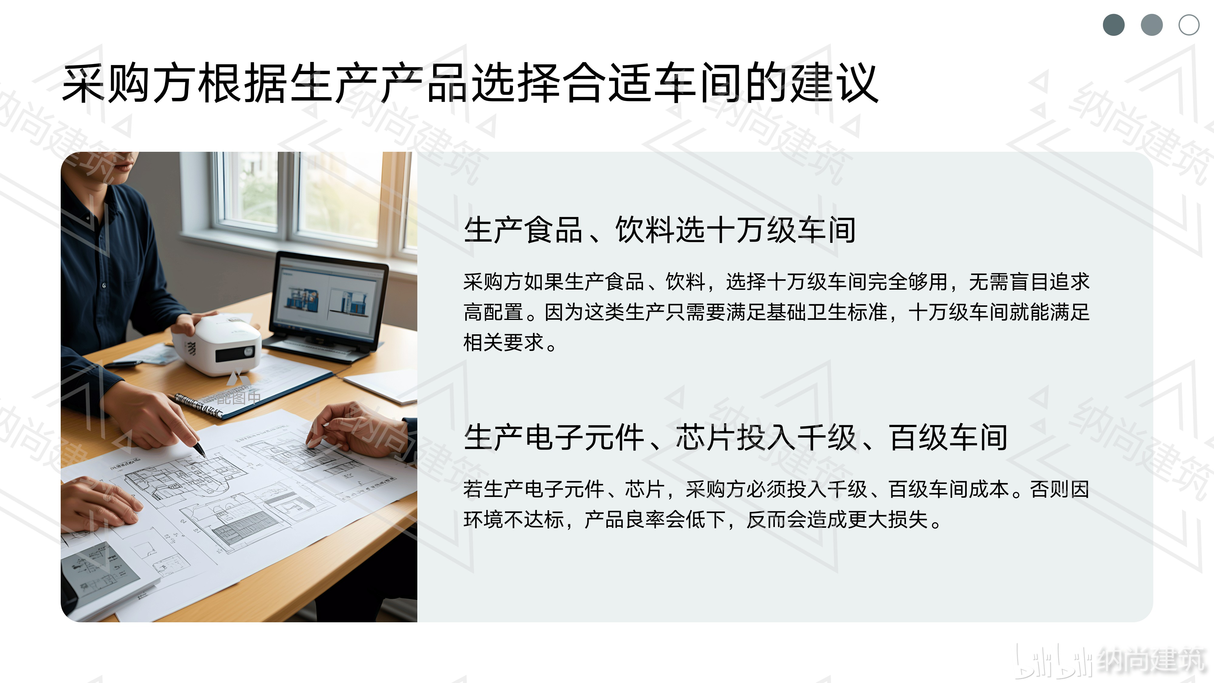 对于采购方而言,无需盲目追求 “高配置”—— 如果是生产食品、饮料,十万级车间完全够用;如果是生产电子元件、芯片,则必须投入千级、百级车间的成本,否则会因环境问题导致产品良率低下,反而得不偿失。
