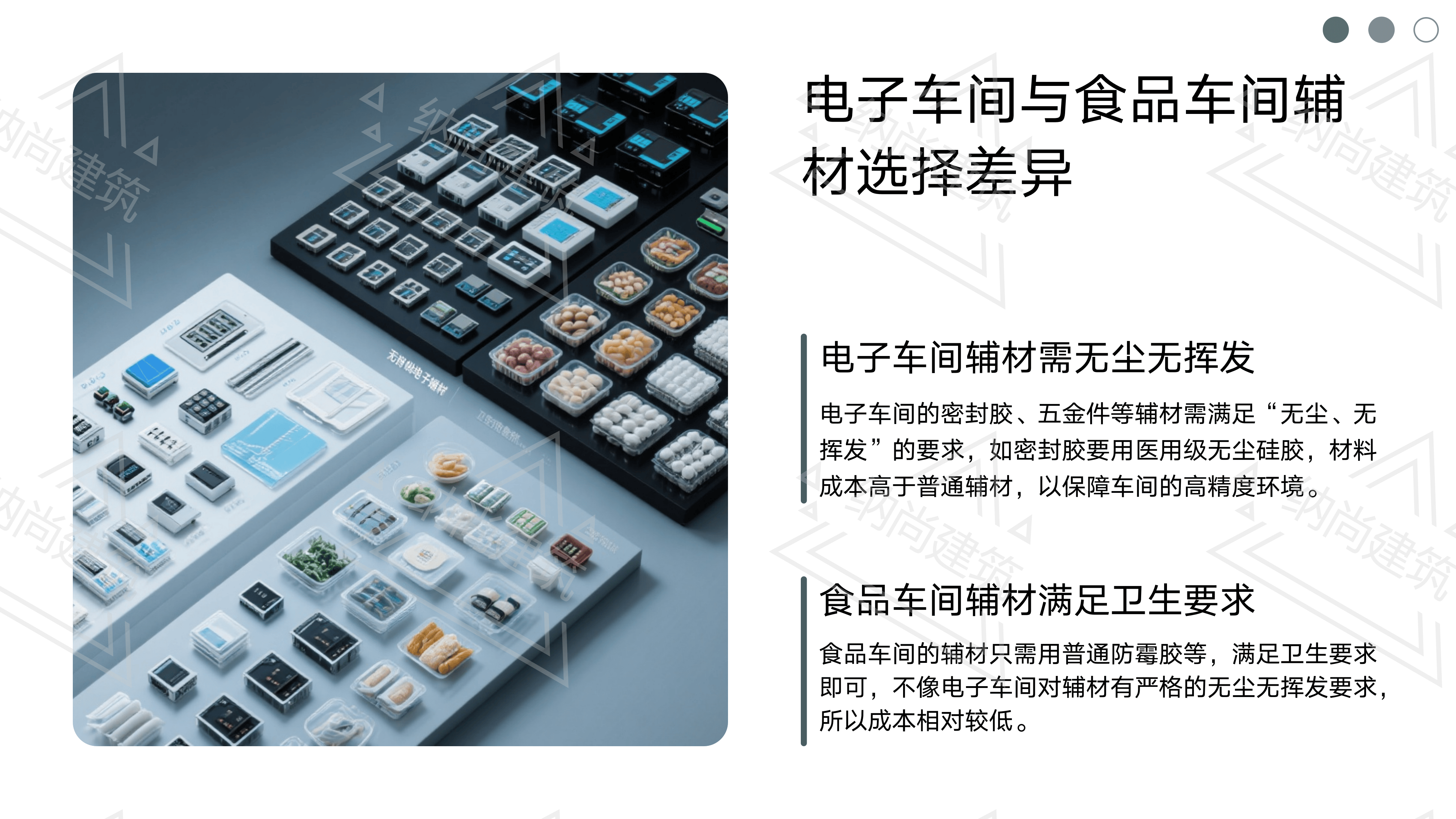 电子车间和食品车间的材料选择、施工工艺,遵循着完全相反的逻辑 —— 电子车间要求 “零粉尘脱落”,食品车间要求“易清洁消毒”。前者的材料标准和工艺难度更高,成本自然水涨船高。