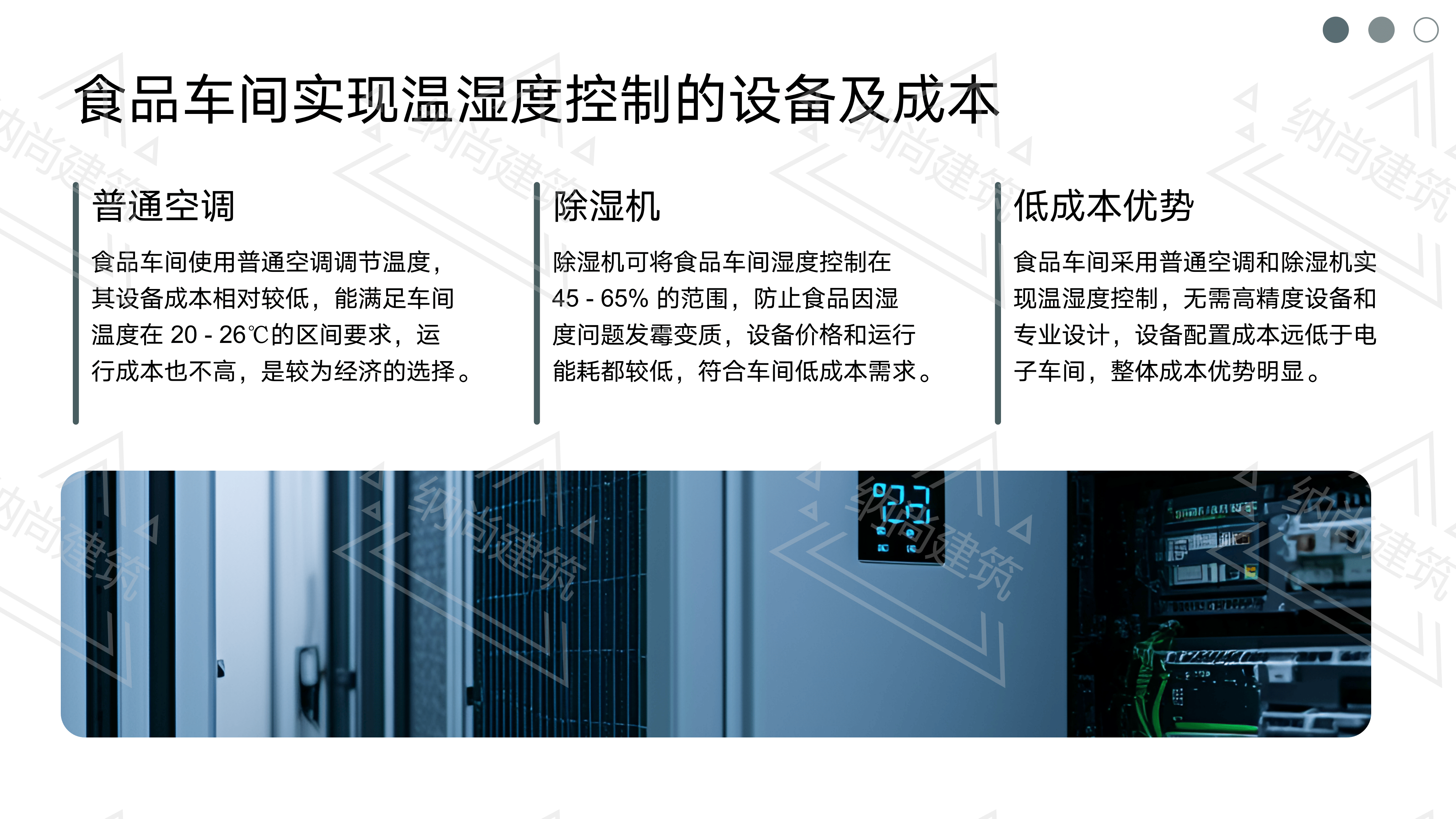 食品车间的温湿度控制则相对宽松,只需满足温度 20-26℃、湿度 45-65% 的区间要求,目的只是防止食品发霉变质。普通空调搭配除湿机就能满足需求,无需投入高精度设备和专业设计成本,设备配置成本远低于电子车间。