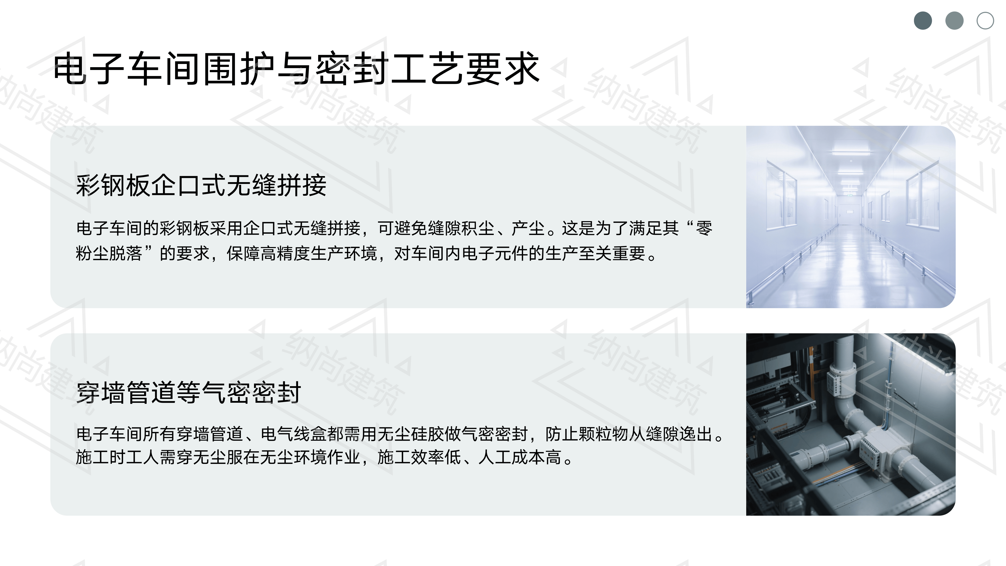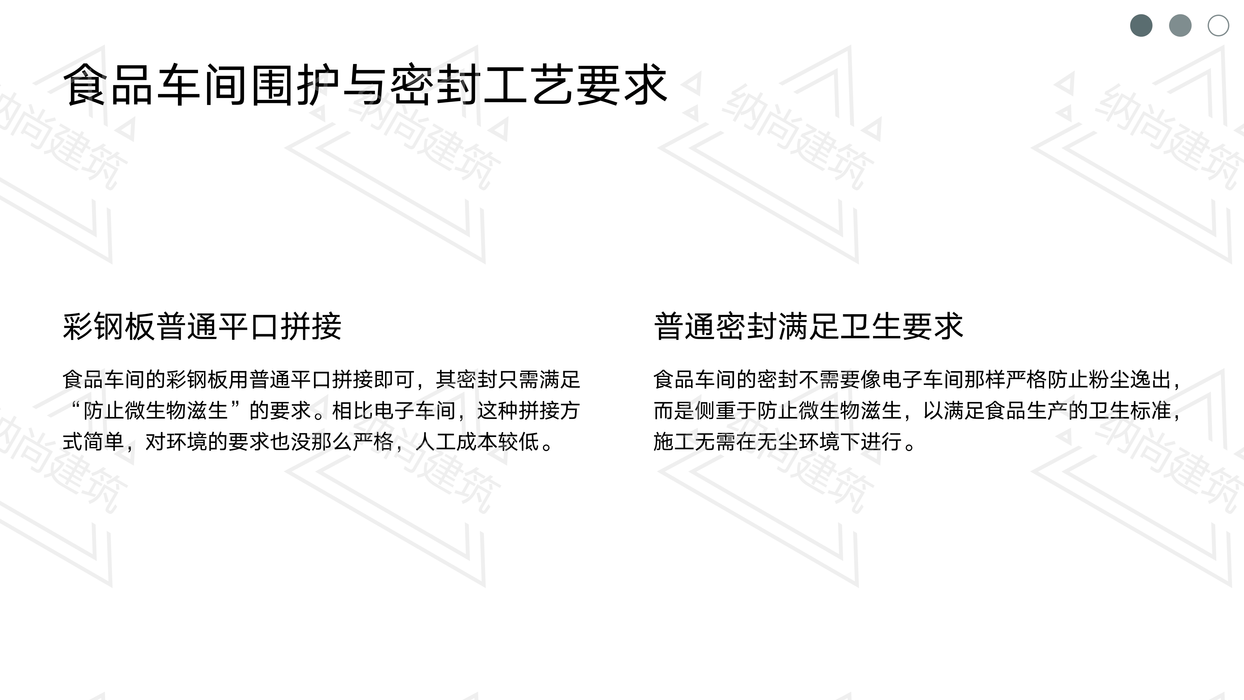 在围护与密封工艺上,电子车间的彩钢板必须采用企口式无缝拼接,避免缝隙积尘、产尘;所有穿墙管道、电气线盒都需用无尘硅胶做气密密封,防止颗粒物从缝隙逸出;施工时,工人需全程穿无尘服,在无尘环境下作业,施工效率低、人工成本高。而食品车间的彩钢板可用普通平口拼接,密封只需满足 “防止微生物滋生” 的要求,施工无需无尘环境,人工成本远低于电子车间。