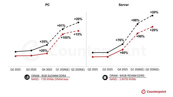 以服务器级64GB RDIMM为例,其合约价从2025年Q4的450美元飙升至2026年Q1的900美元以上,涨幅达100%,且Counterpoint预测2026年Q2价格或将突破1000美元。