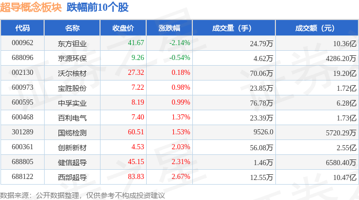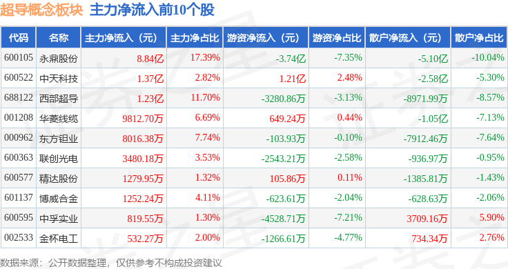 从资金流向上来看,当日超导概念板块主力资金净流入9.99亿元,游资资金净流出3.73亿元,散户资金净流出6.26亿元。超导概念板块个股资金流向见下表:
