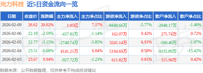 证券之星消息,光力科技2月9日涨停收盘,收盘价26.62元。该股于13点24分涨停,2次打开涨停,截止收盘封单资金为3891.41万元,占其流通市值0.59%。
