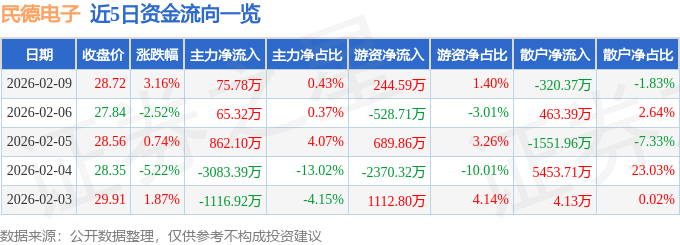 证券之星消息,截至2026年2月9日收盘,民德电子(300656)报收于28.72元,上涨3.16%,换手率4.62%,成交量6.13万手,成交额1.75亿元。