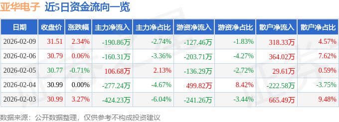 证券之星消息,截至2026年2月9日收盘,亚华电子(301337)报收于31.51元,上涨2.34%,换手率6.0%,成交量2.22万手,成交额6966.96万元。