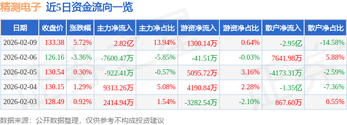 证券之星消息,截至2026年2月9日收盘,精测电子(300567)报收于133.38元,上涨5.72%,换手率6.81%,成交量15.46万手,成交额20.23亿元。