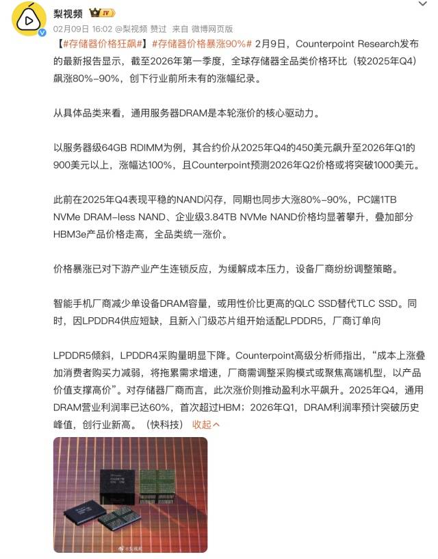 【iMobile爱科技资讯】2月9日,Counterpoint Research发布最新行业报告显示,截至2026年第一季度,全球存储器全品类价格环比2025年第四季度飙涨80%-90%,创下行业前所未有的涨幅纪录,存储器市场迎来剧烈价格波动,上下游产业链格局受到显著影响。