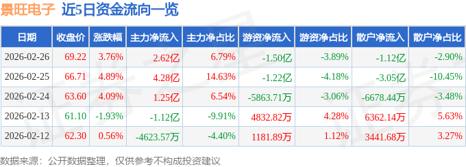 证券之星消息,截至2026年2月26日收盘,景旺电子(603228)报收于69.22元,上涨3.76%,换手率5.75%,成交量56.14万手,成交额38.6亿元。