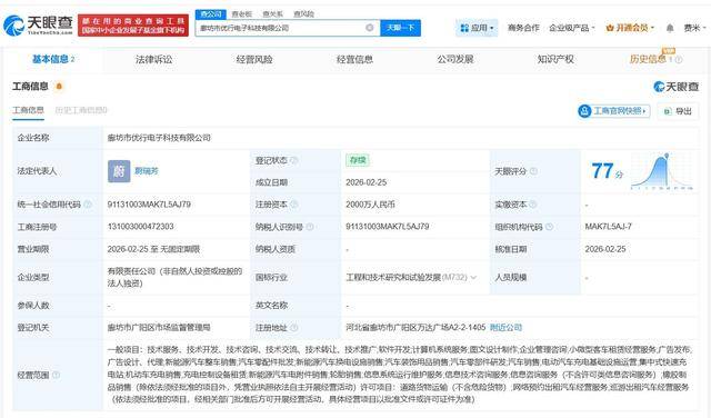天眼查App显示,近日,廊坊市优行电子科技有限公司成立,法定代表人为蔚瑞芳,注册资本2000万人民币,经营范围含软件开发、新能源汽车整车销售、电动汽车充电基础设施运营等,由苏州市吉利优行电子科技有限公司全资持股,后者为曹操出行关联公司杭州优行科技有限公司全资子公司。