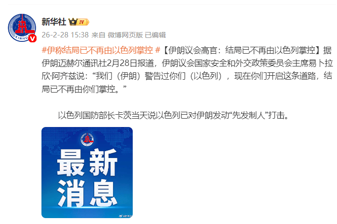 据伊朗迈赫尔通讯社2月28日报道,伊朗议会国家安全和外交政策委员会主席易卜拉欣·阿齐兹说:“我们(伊朗)警告过你们(以色列),现在你们开启这条道路,结局已不再由你们掌控。”
