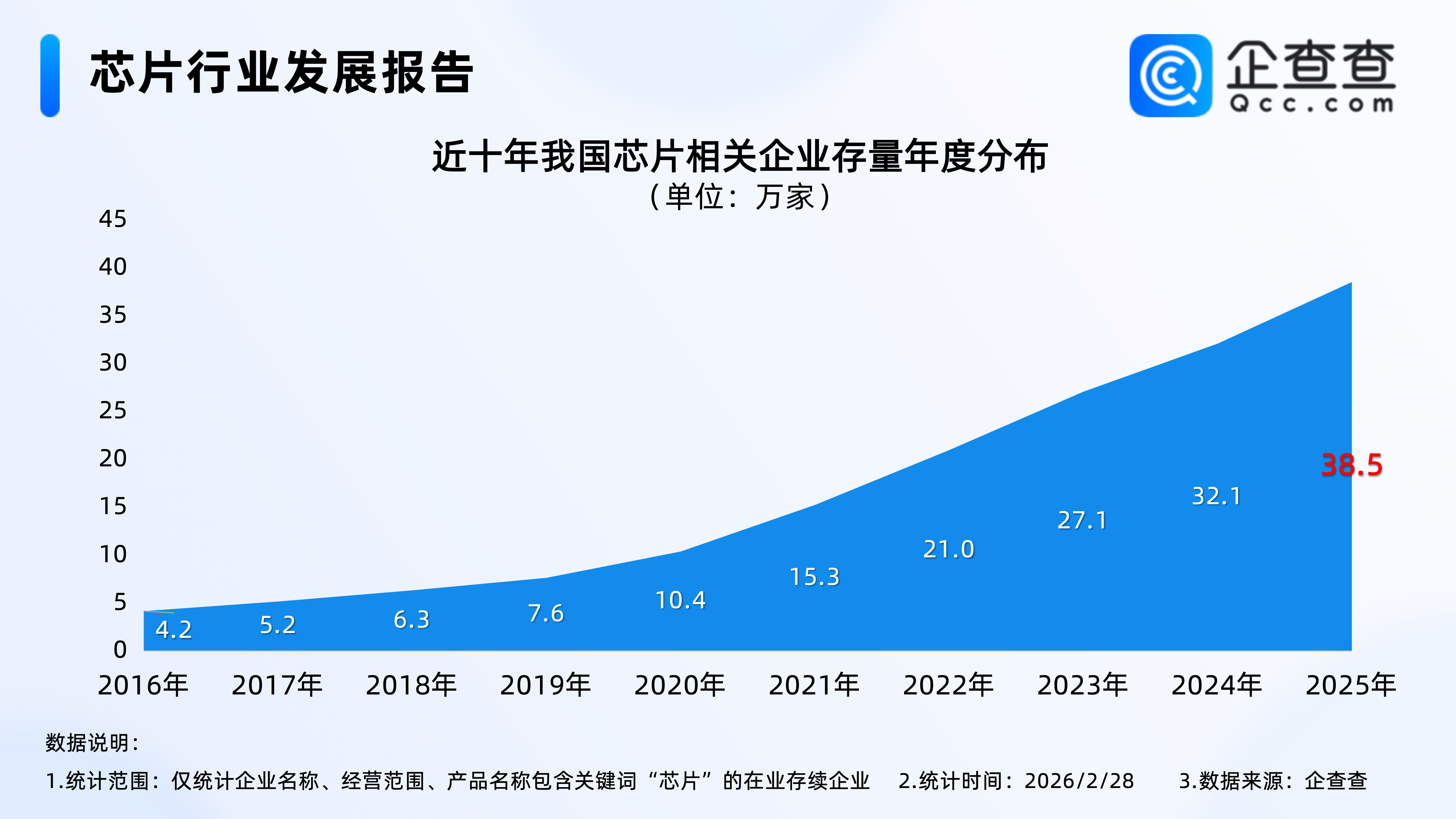 企查查数据显示,近十年,我国芯片相关企业存量逐年稳定增加,2020年开始增速加快,且存量首次突破10万家;2025年年底,我国在业存续38.5万家芯片相关企业。截至2026年2月28日,我国在业存续39.3万家芯片相关企业。