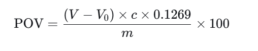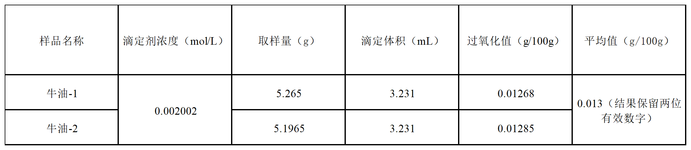POV:过氧化值,单位为克每百克(g/100 g);V:试样消耗的硫代硫酸钠标准滴定溶液体积,单位为毫升(mL);V0:空白试验消耗的硫代硫酸钠标准滴定溶液体积,单位为毫升(mL);c:硫代硫酸钠标准滴定溶液的浓度,单位为摩尔每升(mol/L);0.1269:与1.00 mL硫代硫酸钠标准滴定溶液 [c(Na2S2O3)=1.000 mol/L]相当的碘的质量,单位为克每毫摩尔(g/mmol);m:试样质量,单位为克(g);100:折算为 100 g 试样的换算系数。