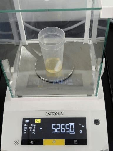 样品称取:准确称取制备好的牛油样品约5.0g(精确至0.001g)于滴定杯中。如样品在称量过程中凝固,可适当温热滴定杯使其融化。