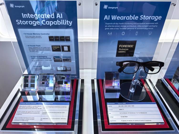 近年来,随着AI眼镜、智能手表等产品非常火爆,AI穿戴已经不再是手机的一个附属产品,而是形成了独立且极具增长潜力的细分品类。江波龙在MWC现场,为我们集中展示ePOP5x、ePOP4x、Subsize eMMC等多款AI穿戴适配产品。