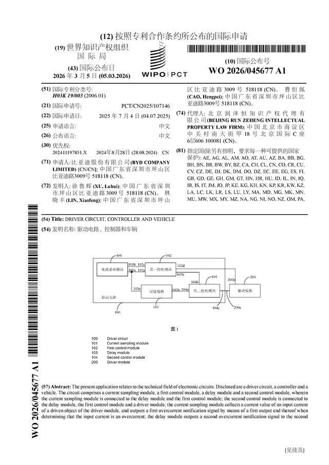 证券之星消息,根据企查查数据显示比亚迪(002594)公布了一项国际专利申请,专利名为“驱动电路、控制器和车辆”,专利申请号为PCT/CN2025/107146,国际公布日为2026年3月5日。