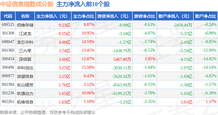 资金流向方面,中证信息(000935)指数成份股当日主力资金净流出合计79.35亿元,游资资金净流入合计13.73亿元,散户资金净流入合计65.62亿元。成份股资金流向详情见下表: