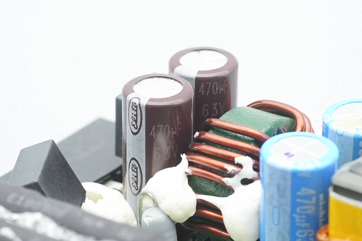 滤波电容来自尼吉康,为UBT系列高可靠长寿命电解电容,耐高温125℃,寿命10000小时,规格为470μF63V。