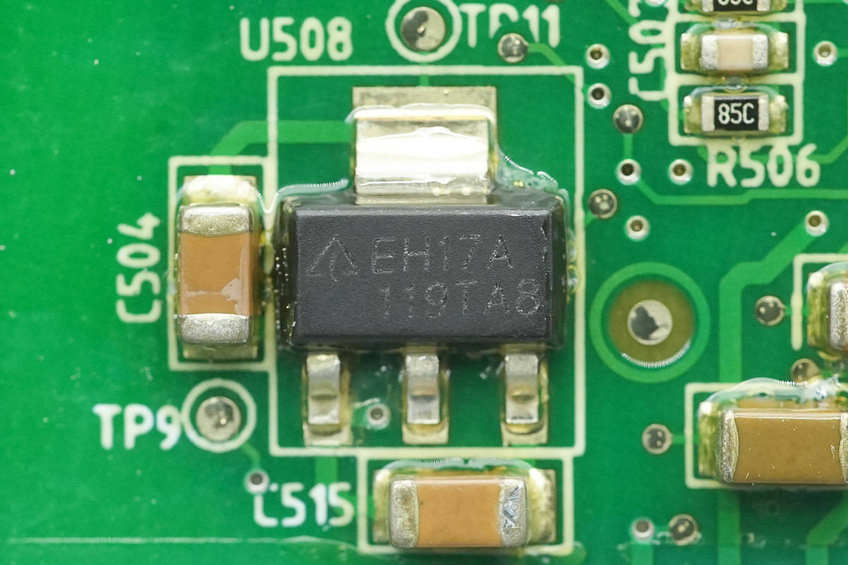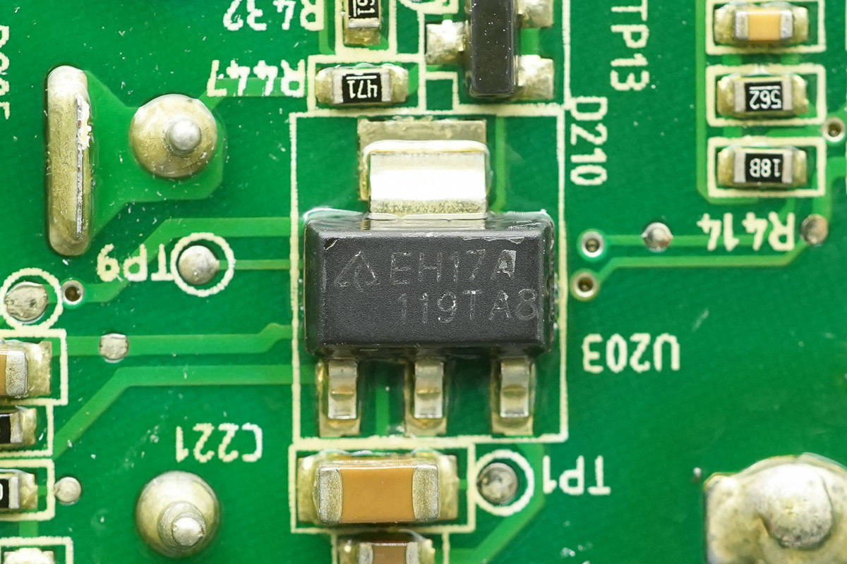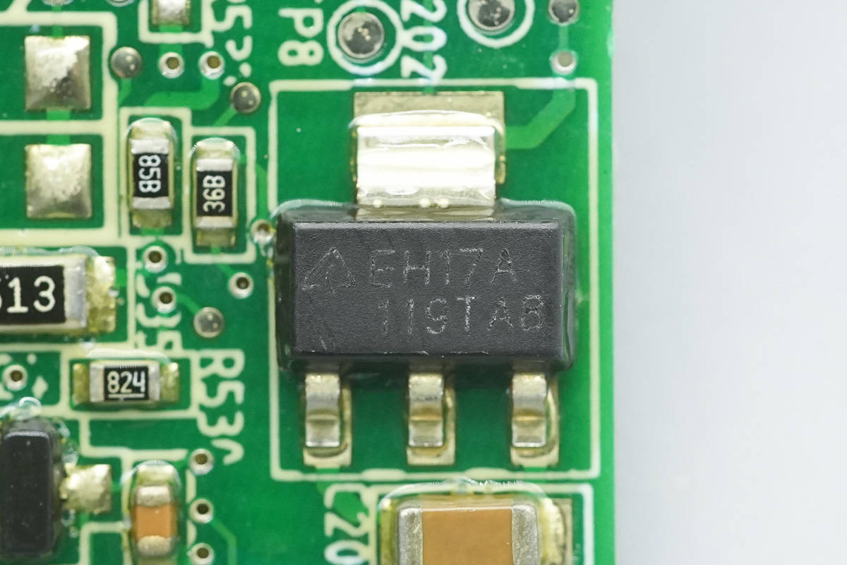 稳压芯片来自达尔,丝印EH17A,型号AZ1117H-5.0TRE1,支持20V输入电压,输出电压为5V,输出电流1A,采用SOT223封装。