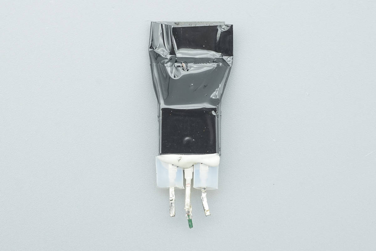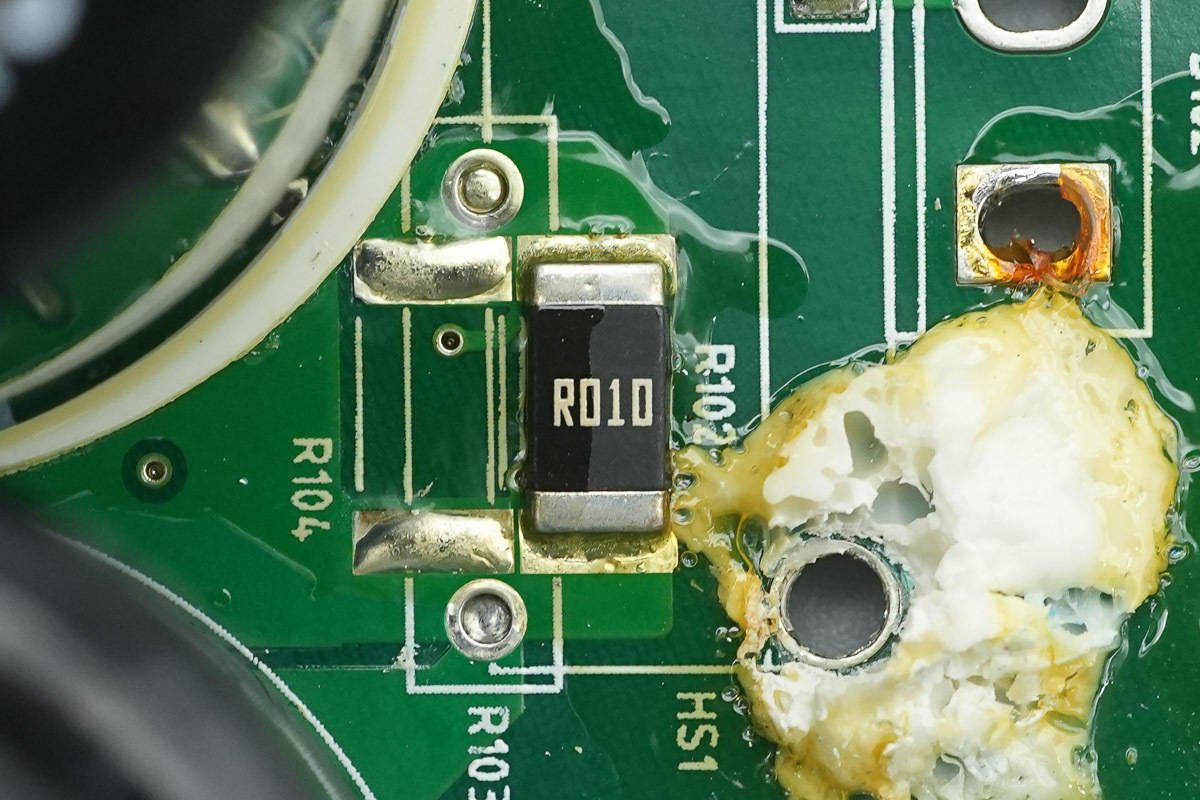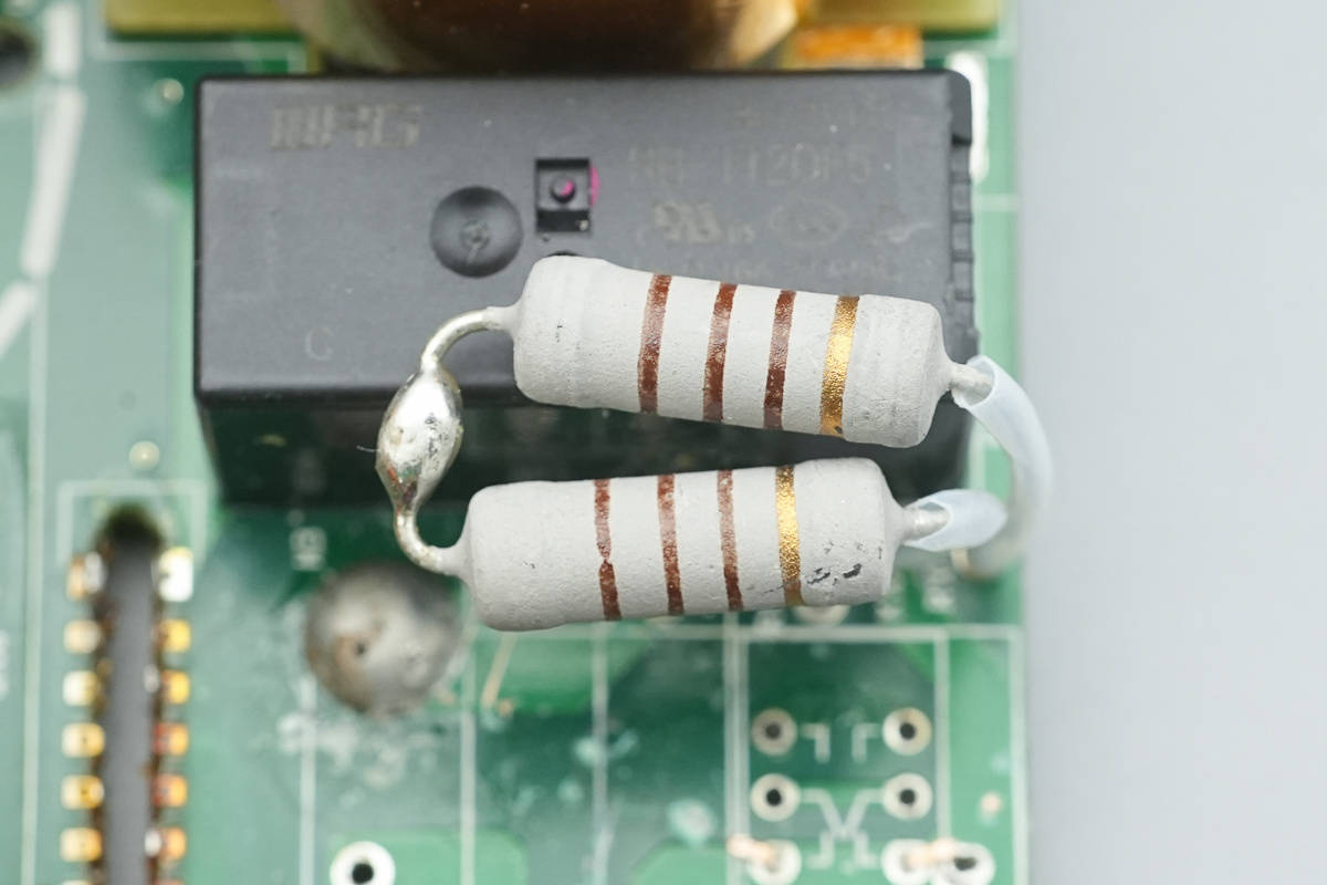 两颗串联的启动电阻特写,引脚外套塑料管绝缘。