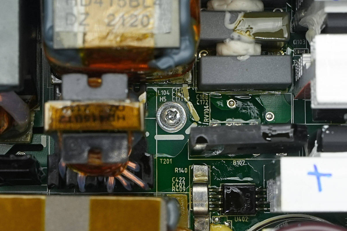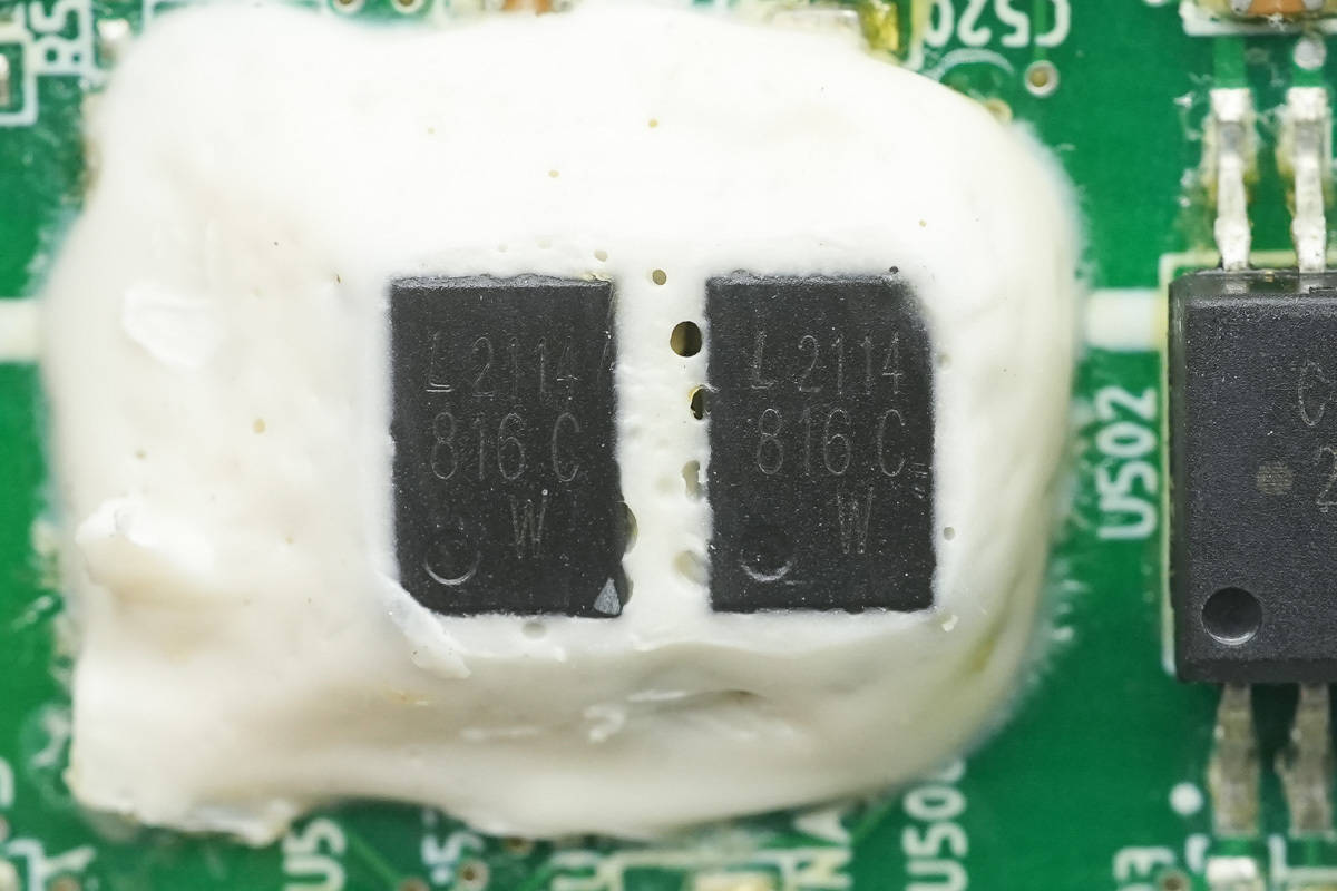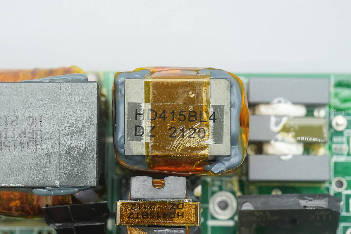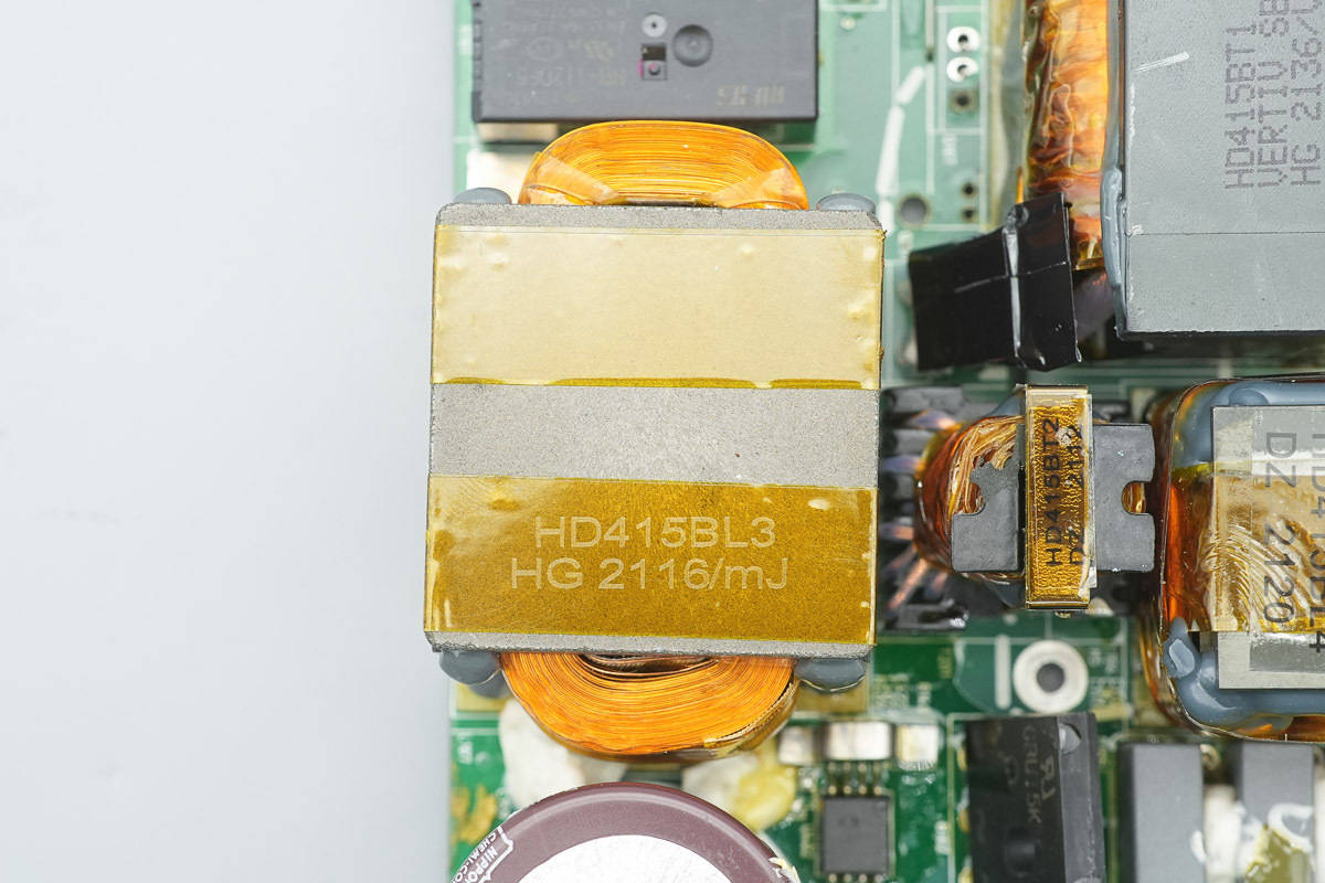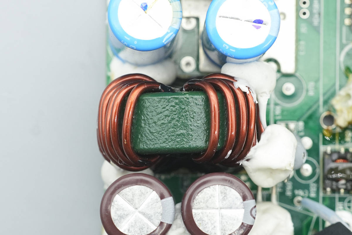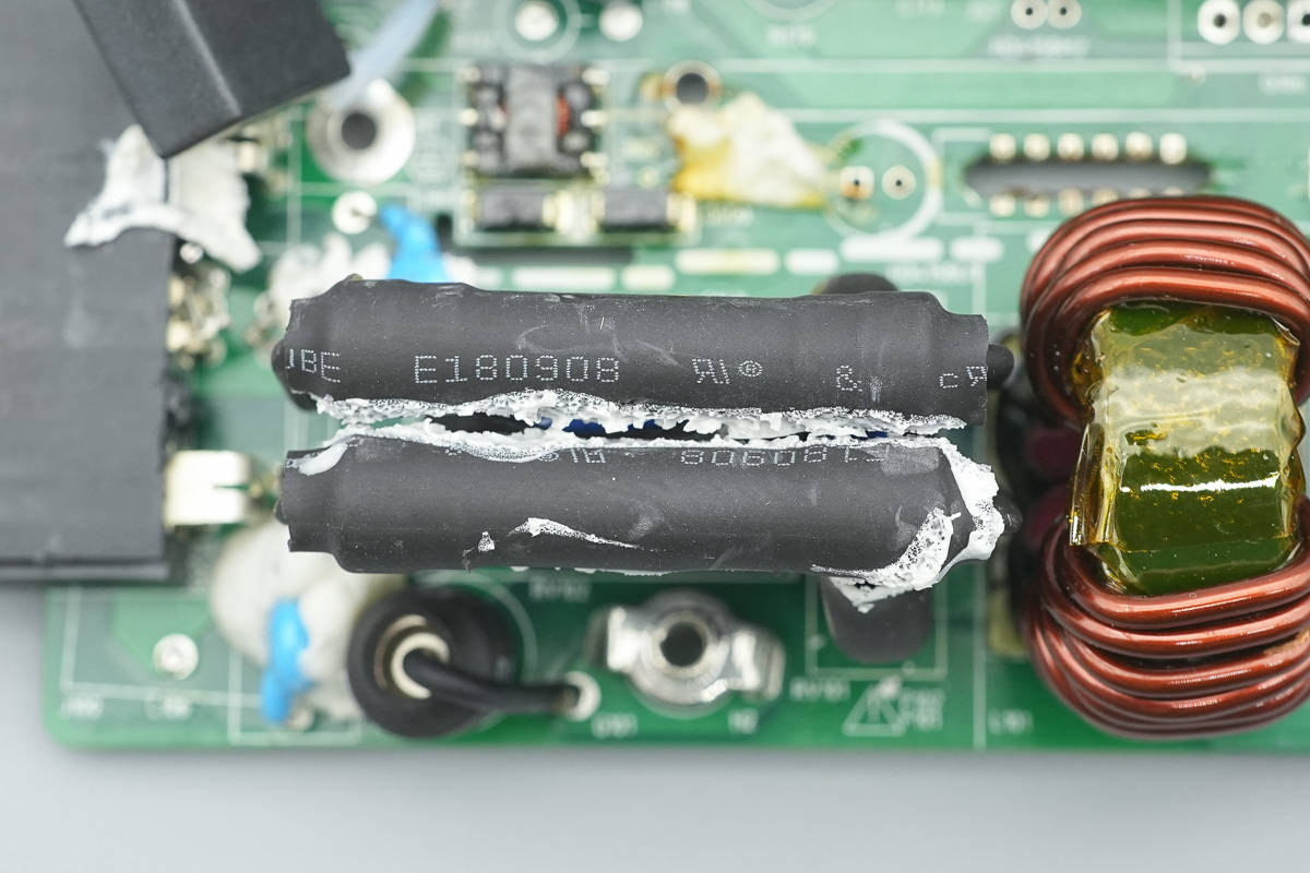 对应PFC开关管和LLC开关管分别使用德州仪器和达尔驱动器,电流和电压隔离采样芯片来自博通。PCBA模块正反面均涂有三防漆保护,元件之间打胶加固,开关管引脚套有绝缘套管,并打胶固定,整体做工用料扎实。