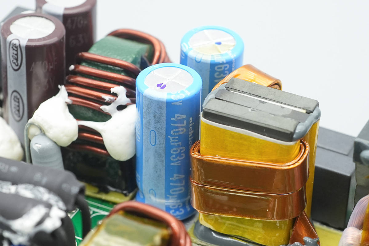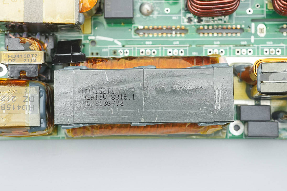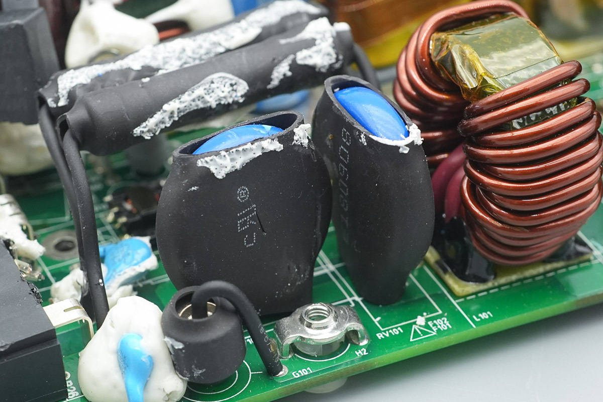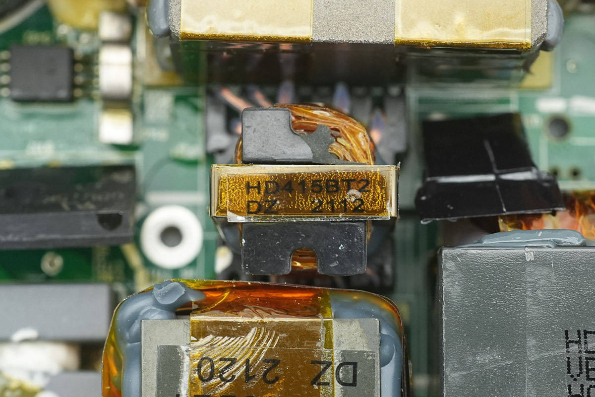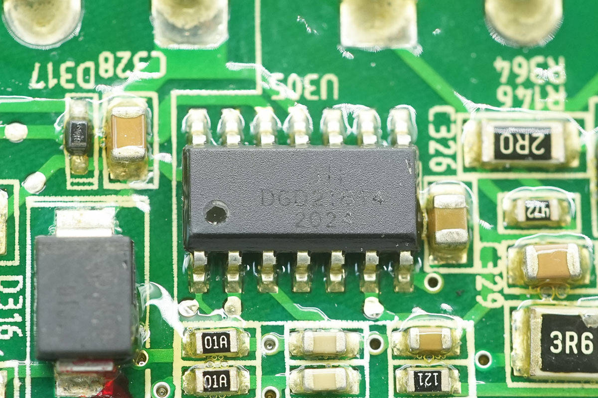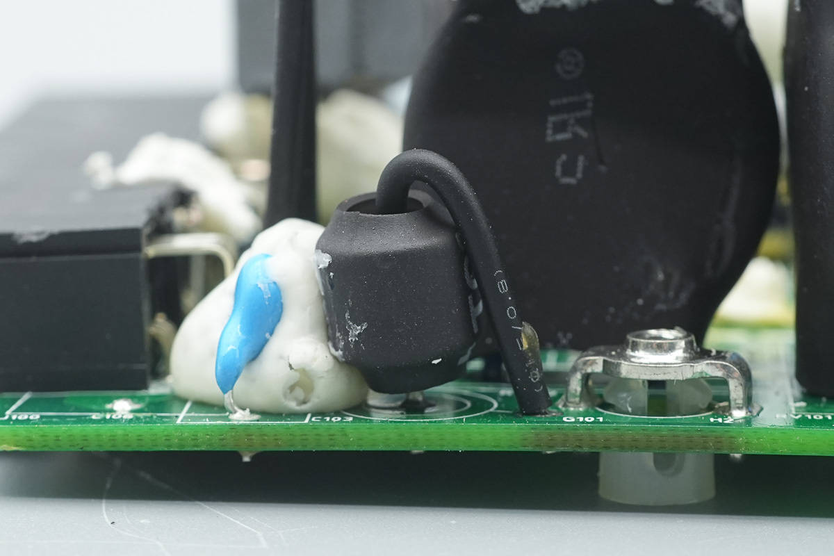 对应PFC开关管和LLC开关管分别使用德州仪器和达尔驱动器,电流和电压隔离采样芯片来自博通。PCBA模块正反面均涂有三防漆保护,元件之间打胶加固,开关管引脚套有绝缘套管,并打胶固定,整体做工用料扎实。