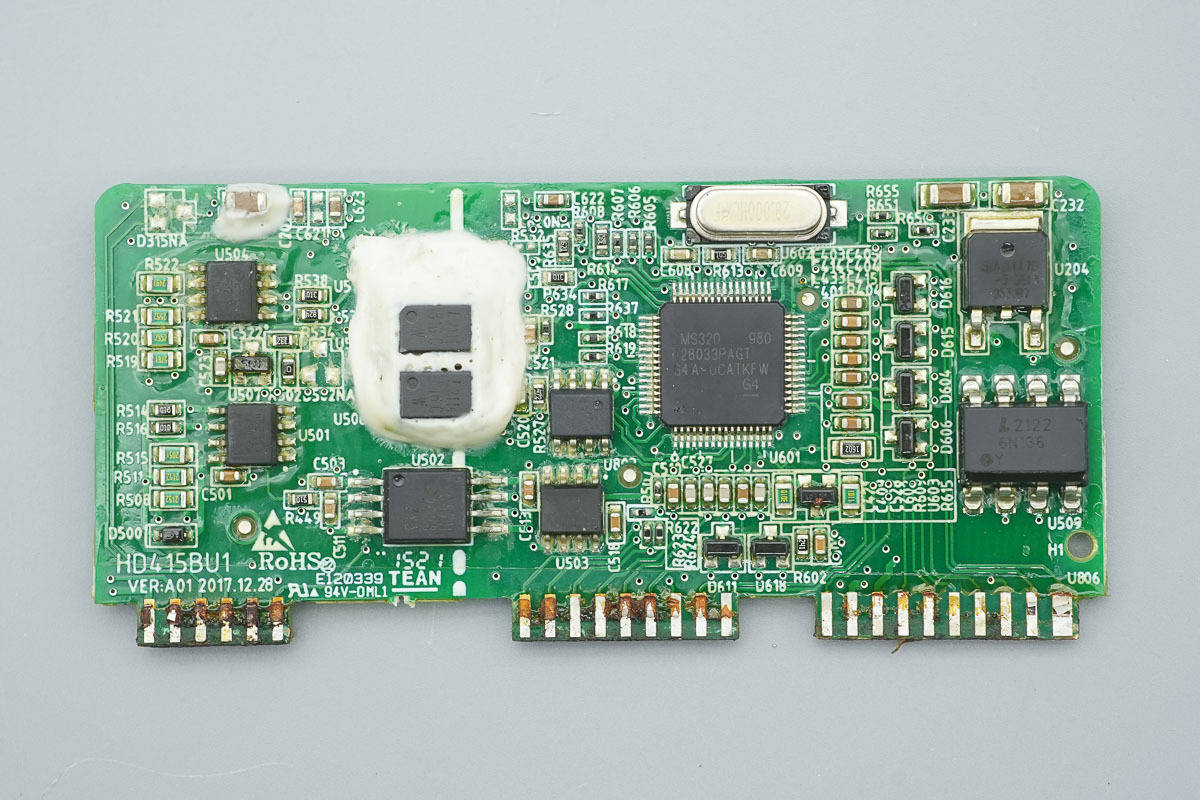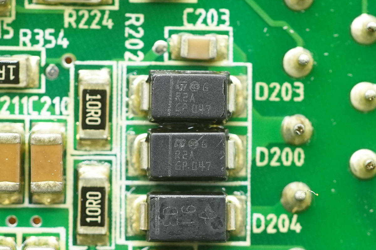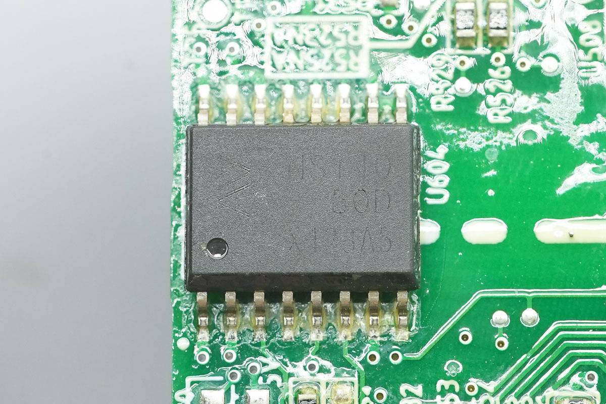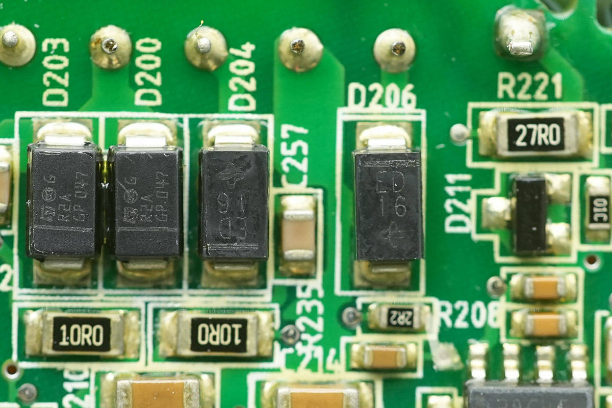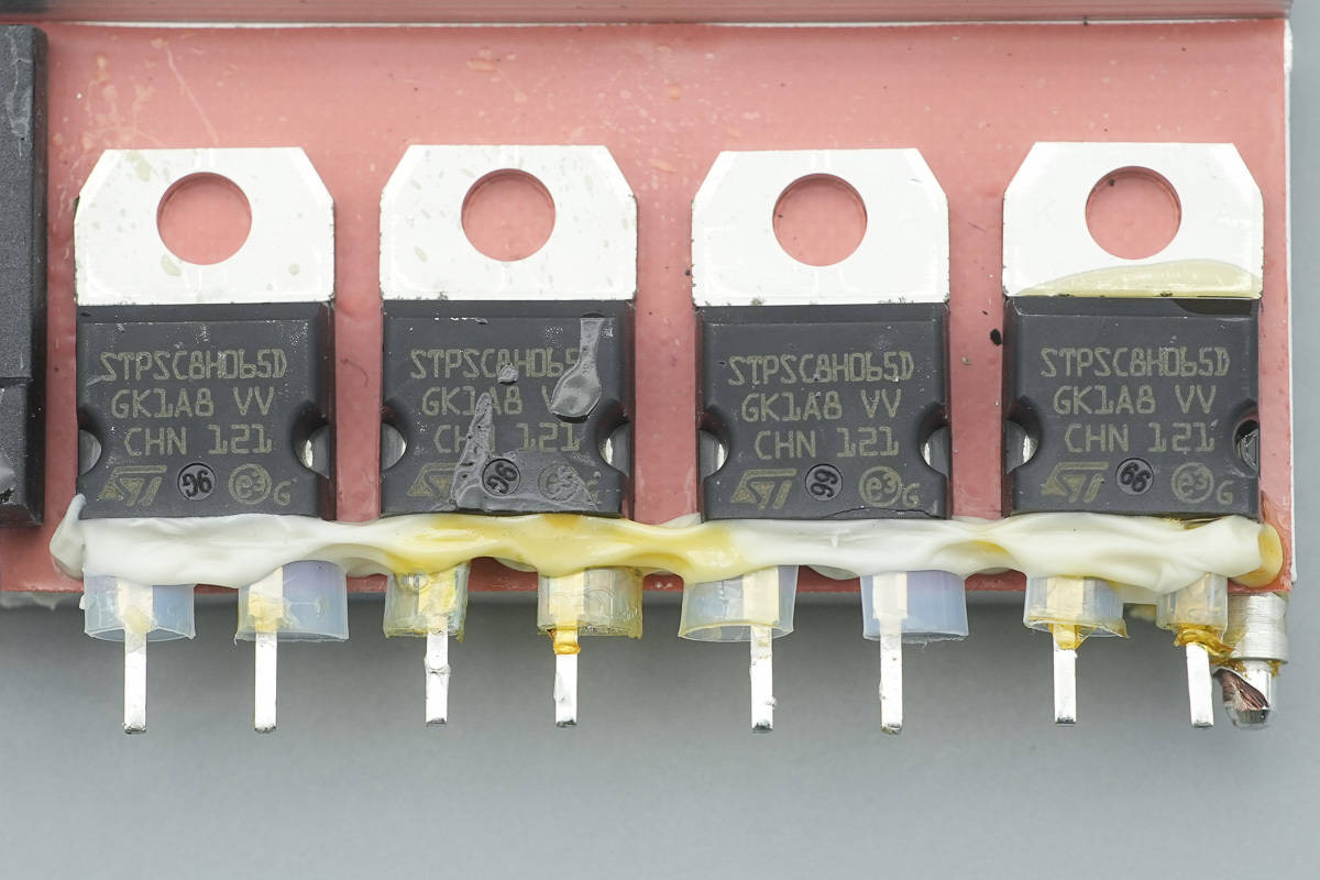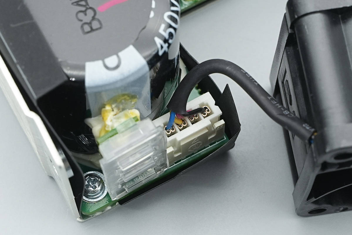 对应PFC开关管和LLC开关管分别使用德州仪器和达尔驱动器,电流和电压隔离采样芯片来自博通。PCBA模块正反面均涂有三防漆保护,元件之间打胶加固,开关管引脚套有绝缘套管,并打胶固定,整体做工用料扎实。