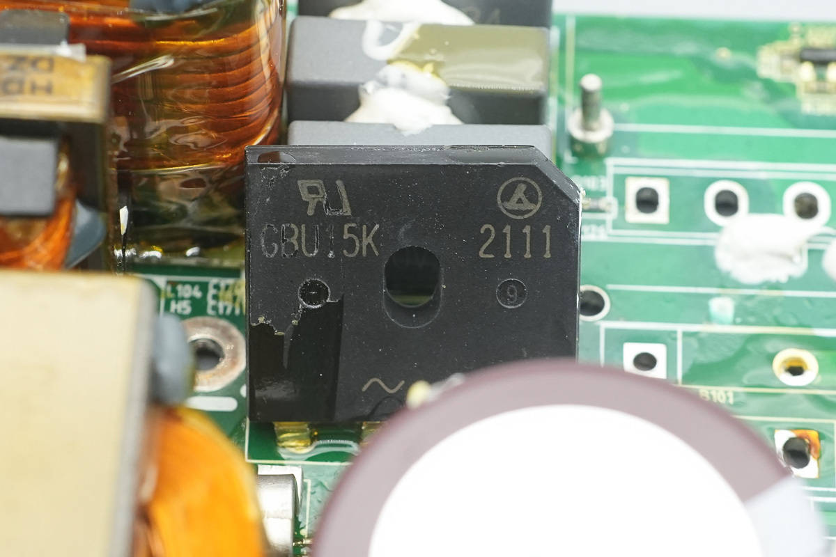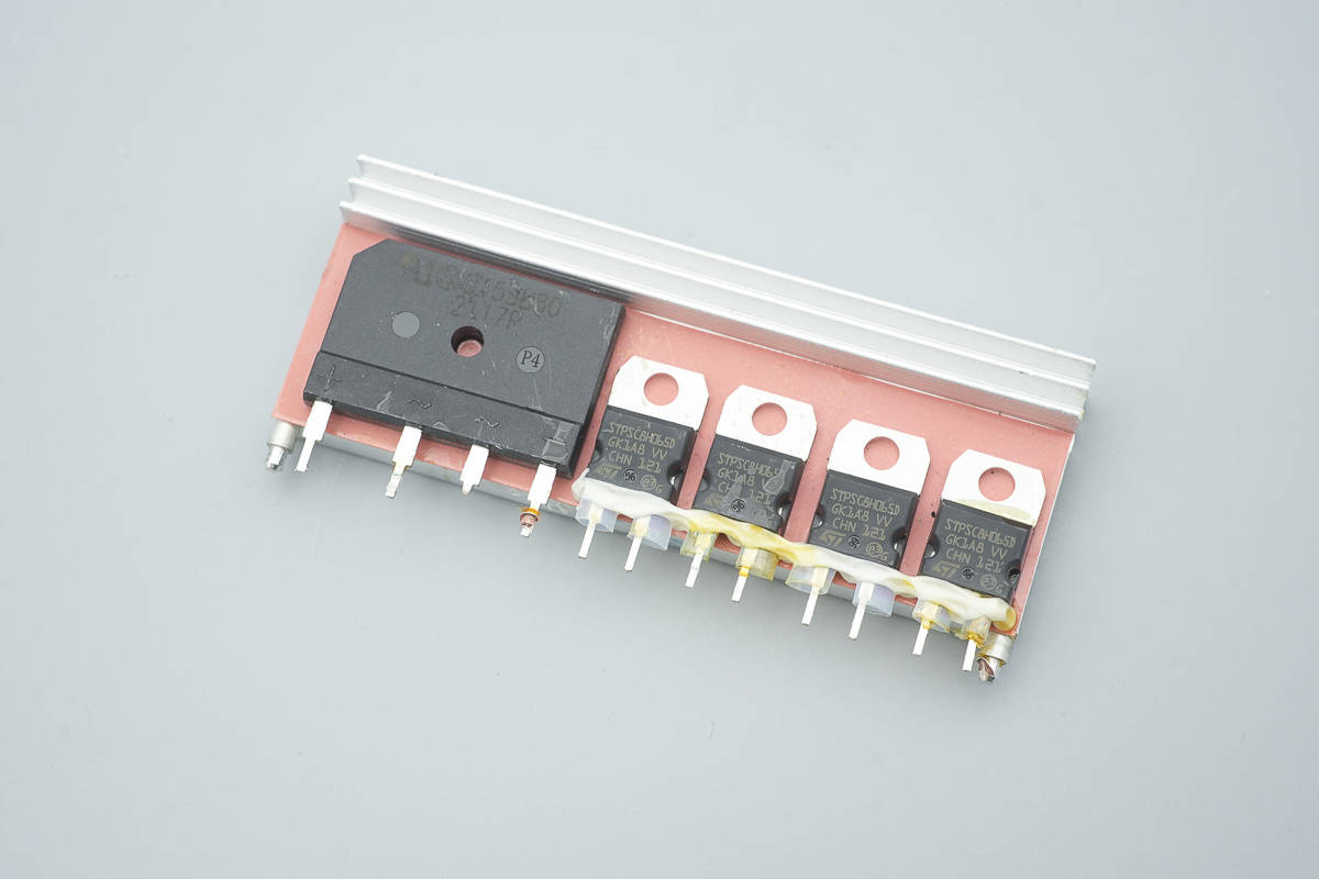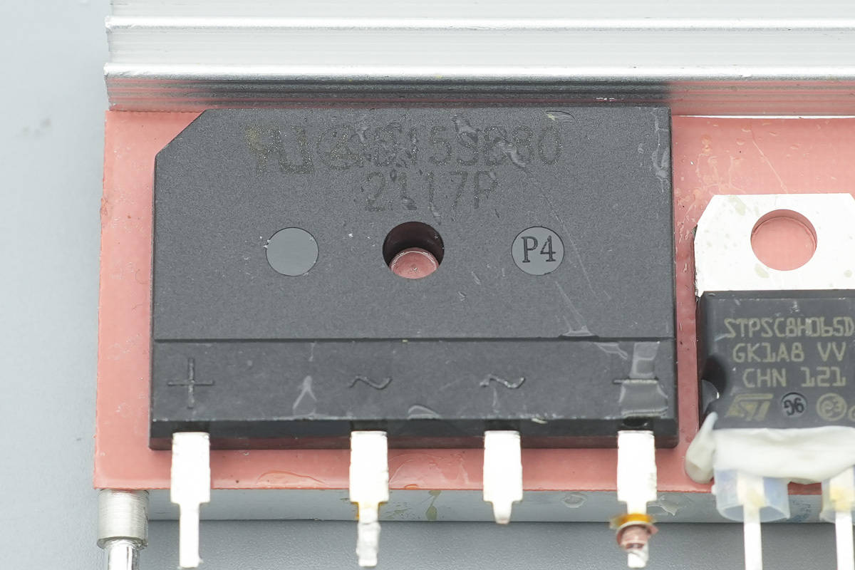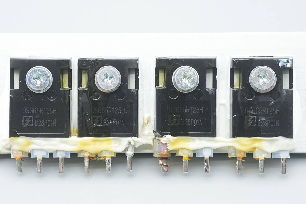 PFC开关管来自东微半导体,型号OSG65R125HF,NMOS,耐压700V,导阻125mΩ,采用TO247封装,引脚套塑料管绝缘,并打胶固定。